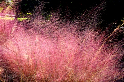 觀賞草的花序雖然不如觀花植物的花朵美麗,但是有多種顏色,集中成片后也十分驚艷。如“網(wǎng)紅”粉黛亂子草,片植開花時云霧一般的大片粉紫色,驚天動地,很是壯觀。這幾年,粉黛亂子草在一些地方甚至成了花海主角,在花卉旅游業(yè)占據(jù)了一席之地,如常州壕熊莊園、蘇州西京灣花田、上海松江60畝花田。蒲葦?shù)幕ㄐ蛴秀y白色,還有粉紅色。入秋后,成片的粉色或銀白色蒲葦花序在微風(fēng)中搖擺起伏,也是不錯的美景。