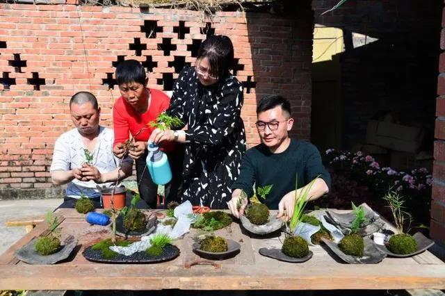 余輝主任一行聽取了項(xiàng)目介紹,隨后來(lái)到盆栽示范戶家中調(diào)研七彩林科產(chǎn)業(yè)項(xiàng)目發(fā)展情況?,F(xiàn)場(chǎng)由我公司資深園藝師正為貧困戶們耐心地傳授盆栽栽培技術(shù),集中完成了苔玉等精美盆栽產(chǎn)品的裝盆制作。