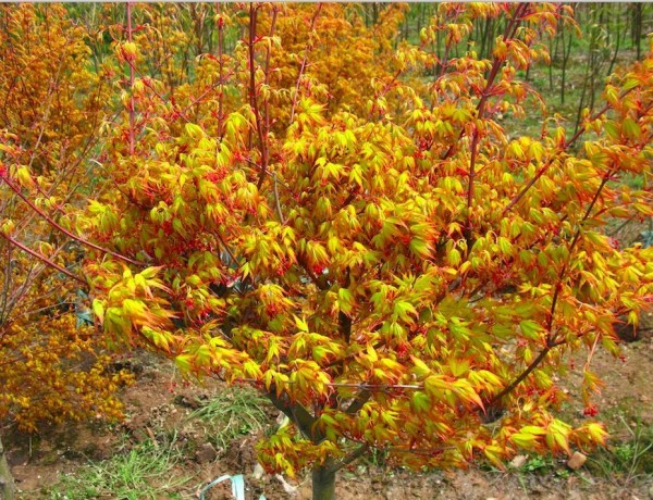 [品種特點(diǎn)]同樣為七彩林科引種馴化的雞爪槭變異品種“金貴”,春天,其新葉為亮黃色,葉片邊緣為橙紅色,炫彩奪目。夏天,成熟的葉子會(huì)變成亮綠色。秋天,葉片最后會(huì)變成由橙色和黃色合成的柔色。株型優(yōu)雅美觀。