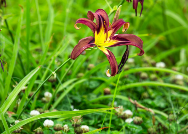 花暗紫色,花喉綠色,花徑12cm,花型外卷呈三角型,花葶高60cm,單花莛花量平均15朵,花為中早花期,半常綠品種。